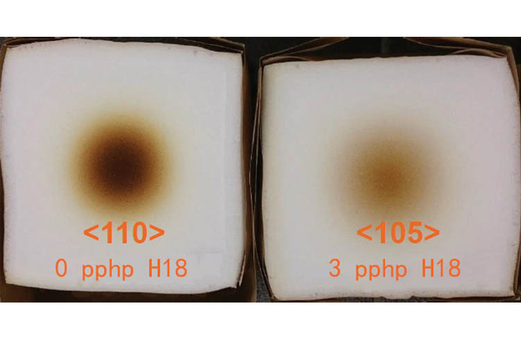 如圖1所示,在參考配方實(shí)驗(yàn)室條件下,密度為16kg/m3海綿中添加3pphp和5pphp 的nt add h18,其硬度增加達(dá)到25%和35%。